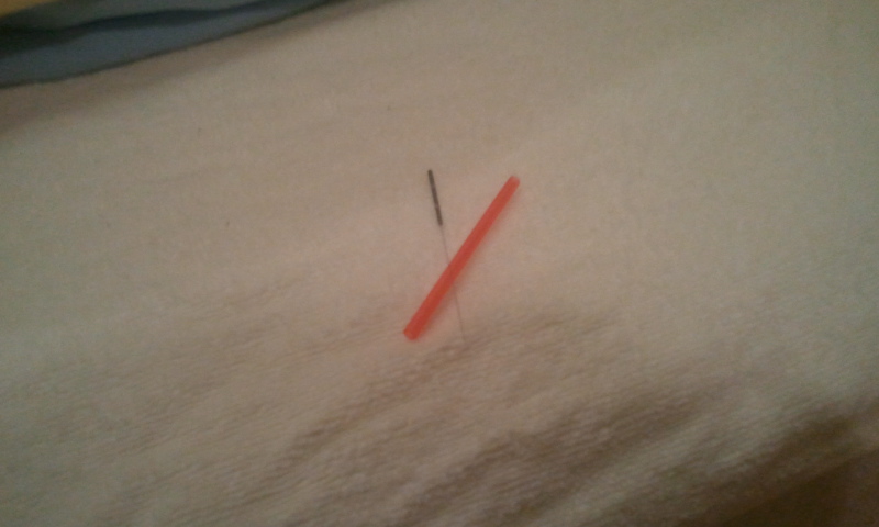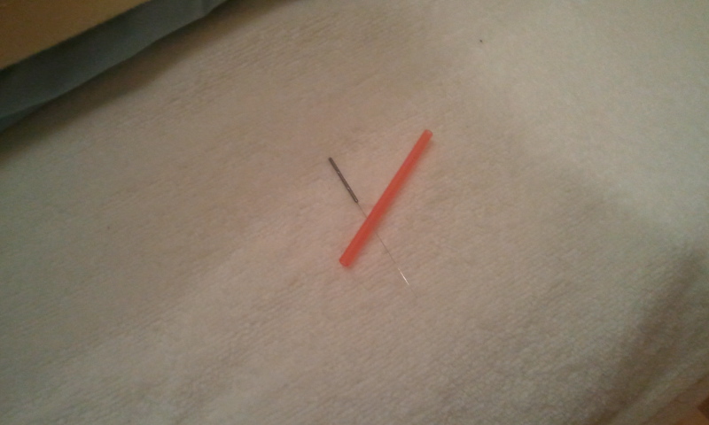 写真をクリックすると拡大しますので、その細さを見てください。さらにオレンジの管が鍼管でこれを被せることで刺す時の痛みが無くなります。この鍼管は日本で発明されたとのこと。