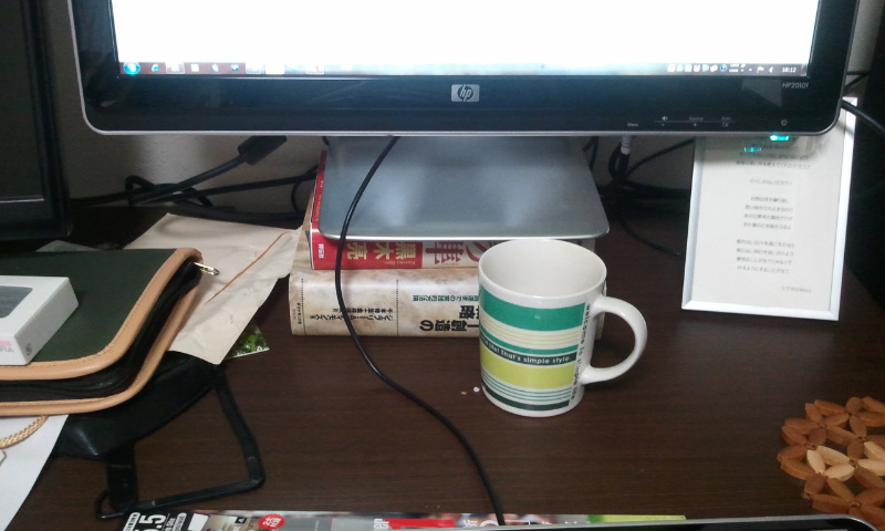 ちょうどマグカップ分位の高さにして目線の位置にモニタが来るようにしています。